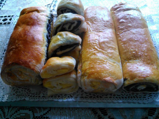 2.Tehát a tésztát ketté vesszük, nyújtjuk,kinyújtva még ketté vágjuk a kihűlt pudinggal megkenjük és feltekerjük. Sütőpapiros őzgerinc, kuglóf formába tesszük Nem kelesztjük újra.