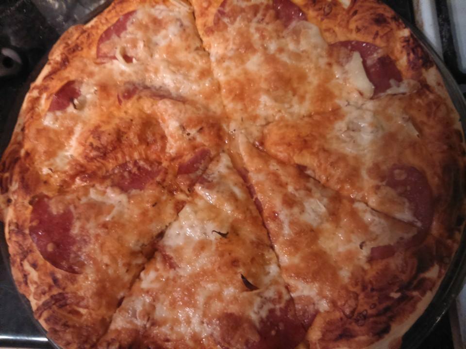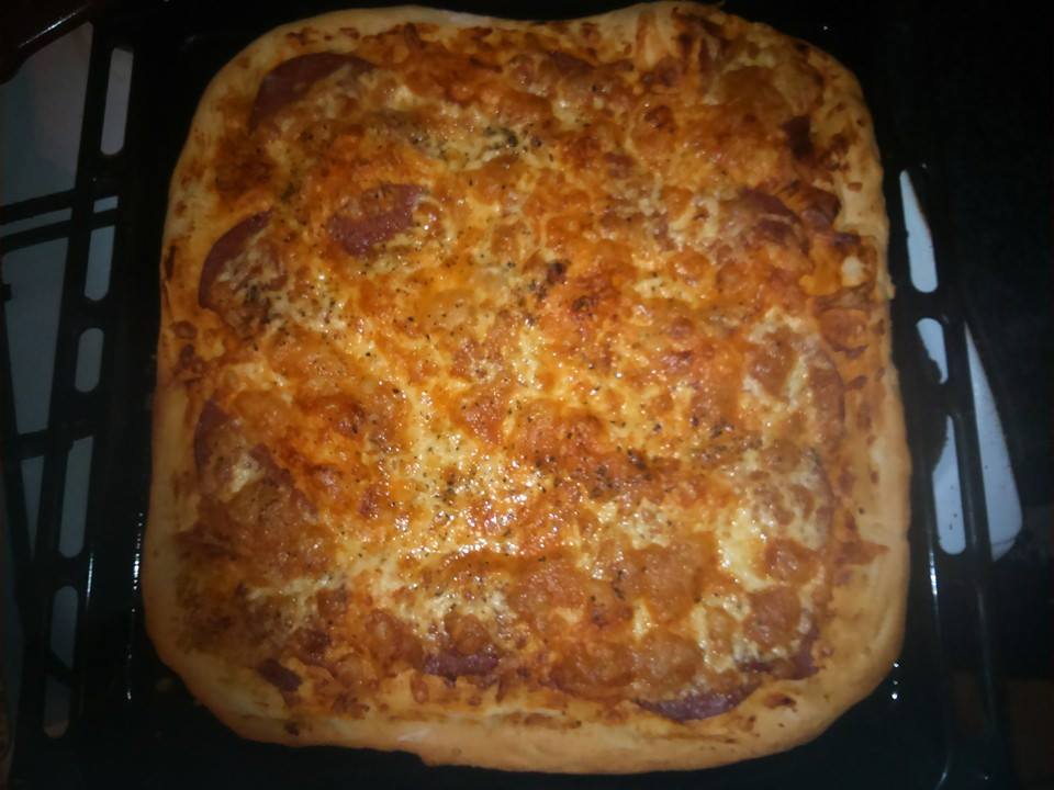A kenyérsütőmbe "beledobáltam" a hozzávalókat, és elinditottam. Mikor bedagasztotta a tésztámat, kiolajoztam egy gáztepsit és a pizza tálamat. A tésztát ketté vettem, és kis nyújtófával kisodortam. Megkentem pizzakrémmel, tettem rá felvágottat, az egyikre simán a másikra kis zöld paprikával. Pár csipet bazsalikom és oregánó. Rá a reszelt sajt, és mehet az előmelegített sütőben.